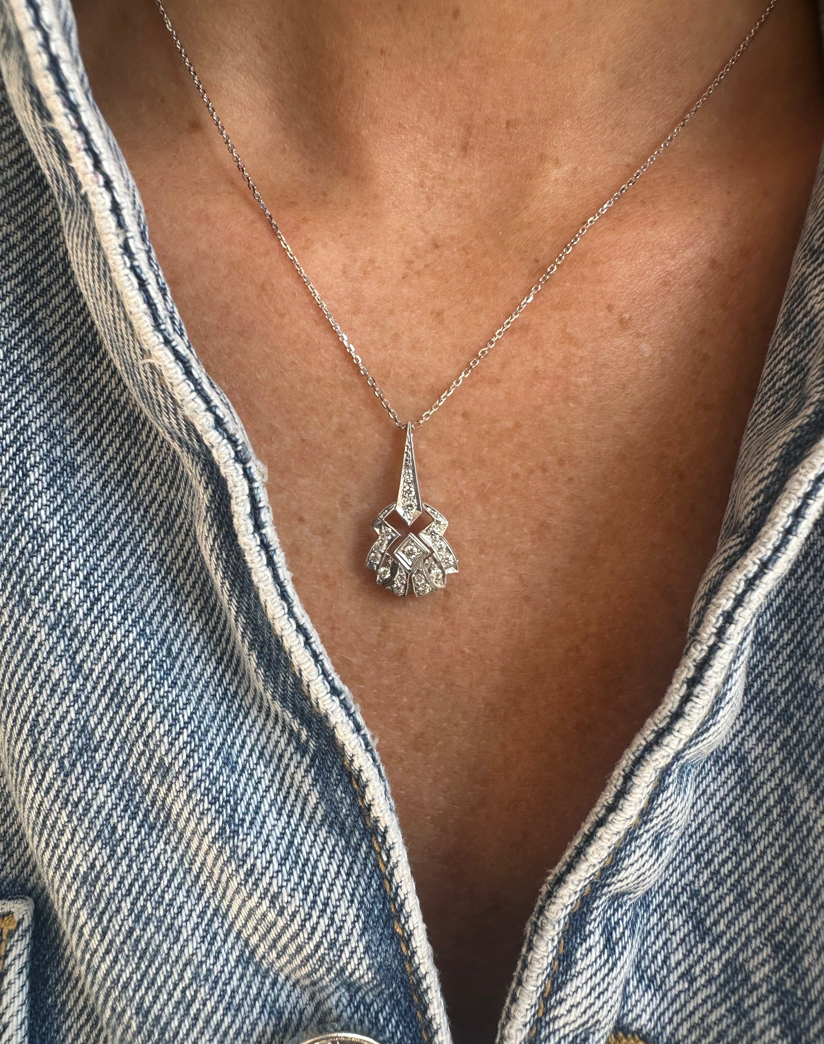 Pendentif Vintage en platine serti de diamants 0,23ct FGVVS sur chaine en or blanc 18KT