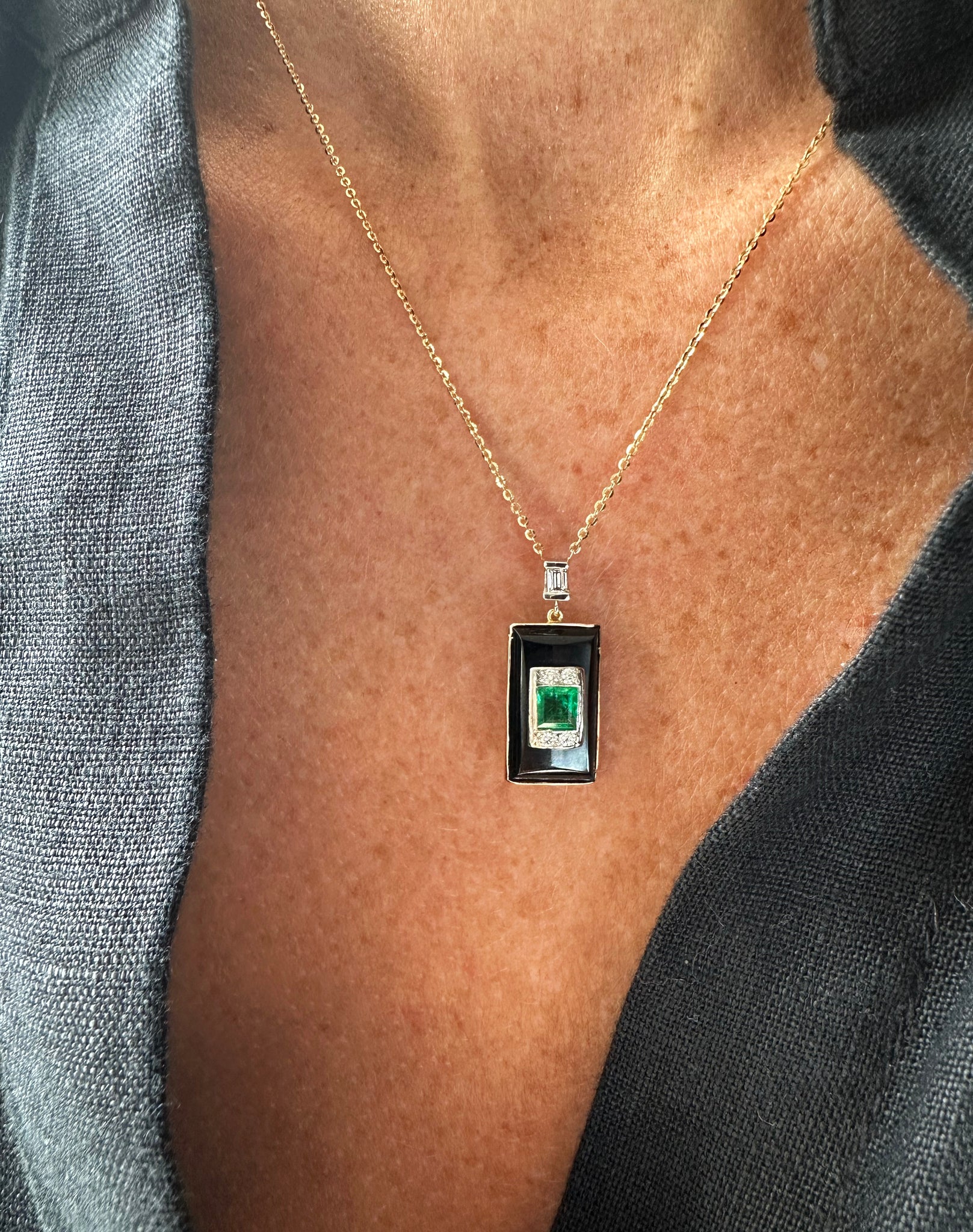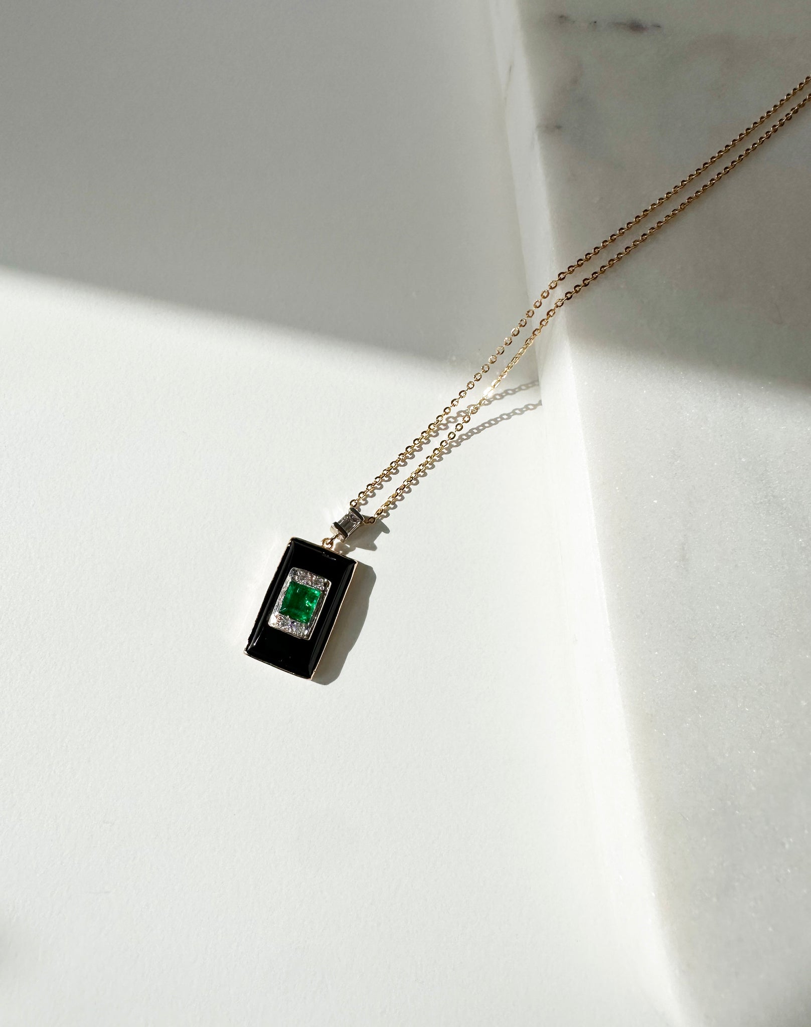 Collier Vintage en or jaune 18KT & platine serti avec de l'onyx & émeraude, diamants & diamants de taille baguette