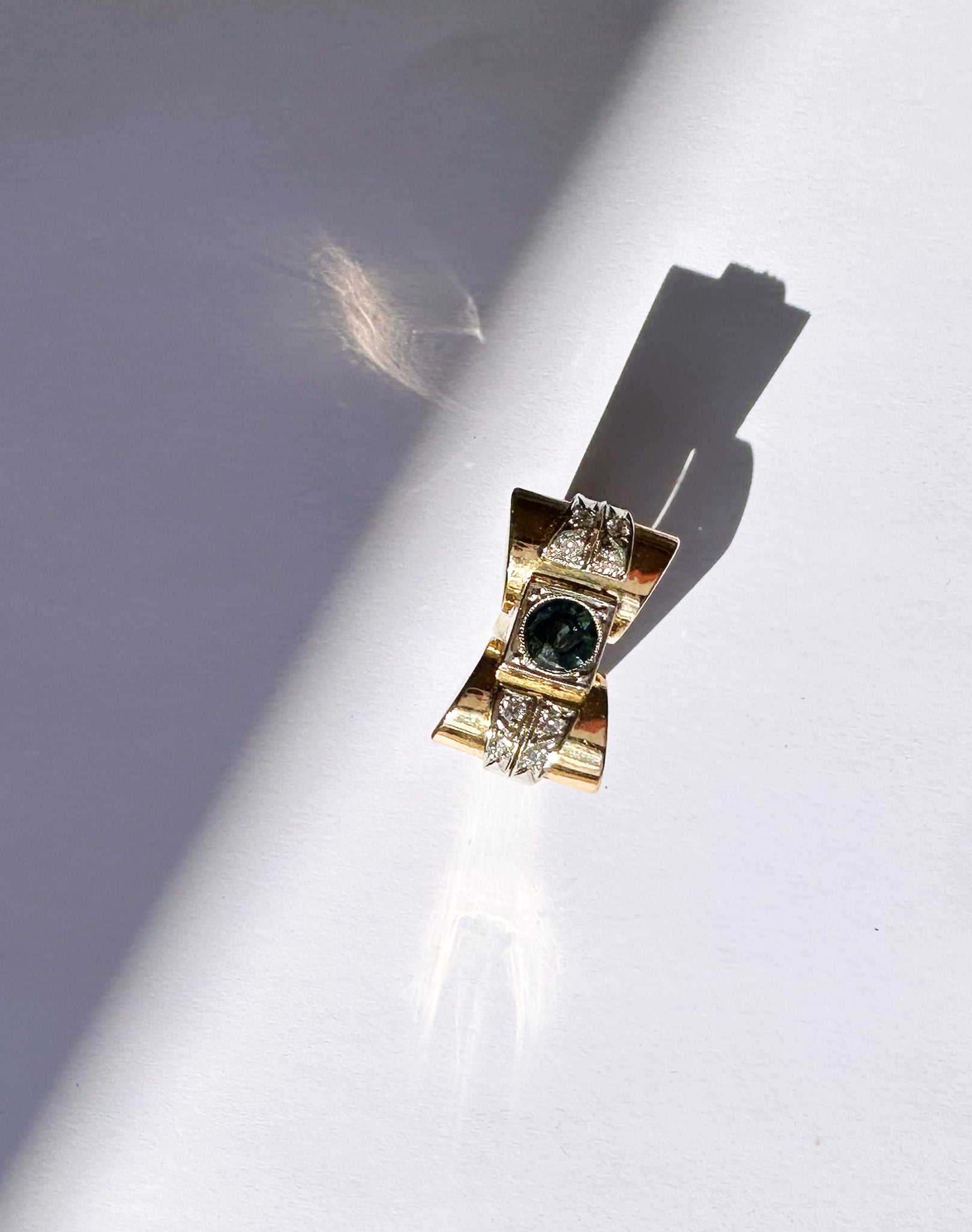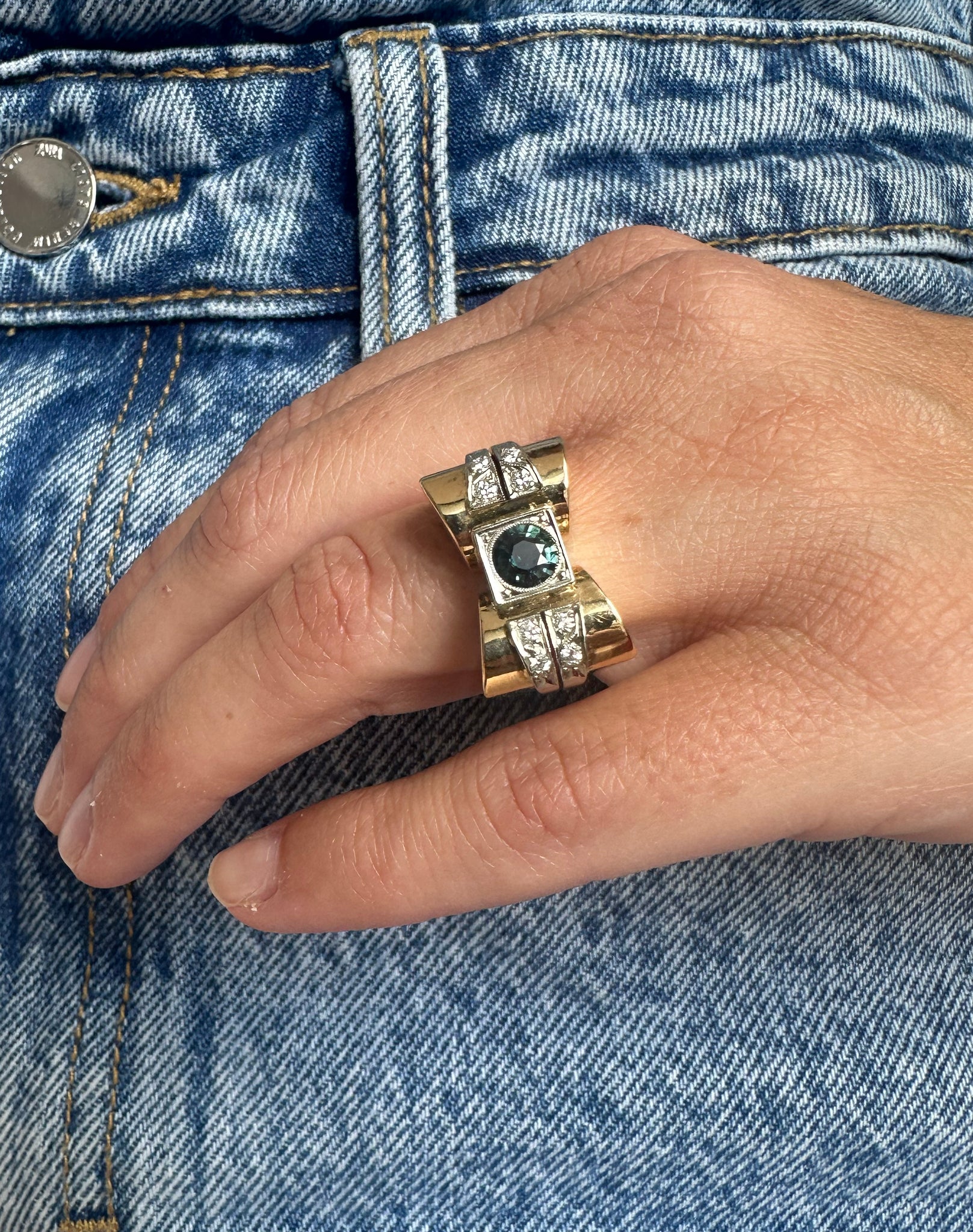 Bague Vintage tank bicolore avec saphir teal 0,53ct & diamants 0,15ct